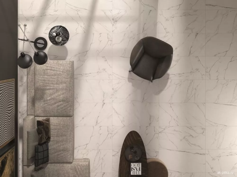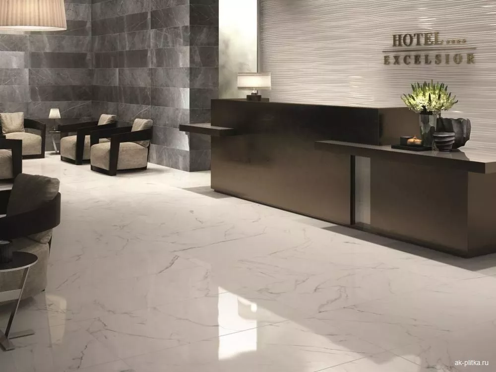 Возможность использовать напольную и настенную облицовку в одном дизайне и близких оттенках позволяет гармонично сочетать отдельные зоны помещения. Полированная поверхность мягко отражает свет, что обеспечивает ощущение легкости и простора в любых интерьерах — от нежного романтизма до мистической готики.