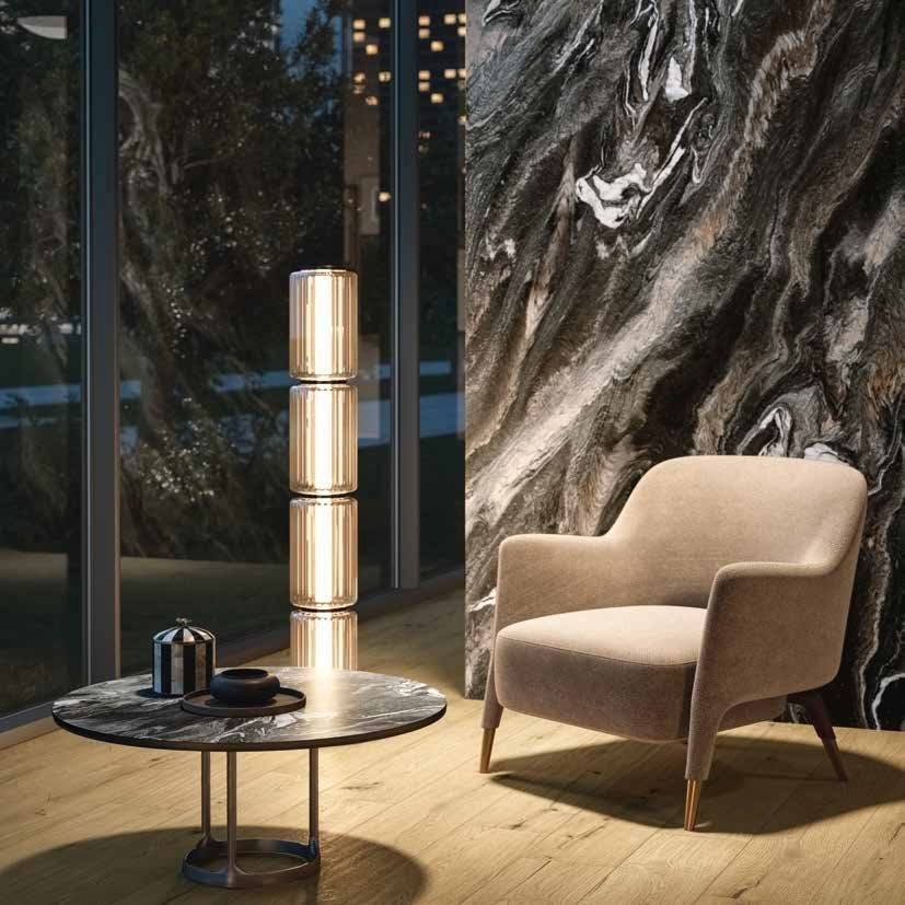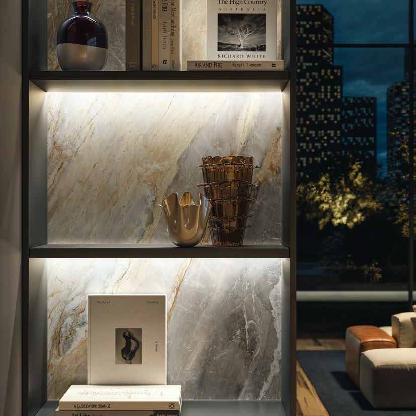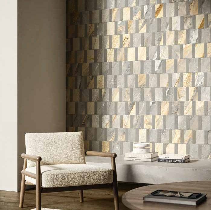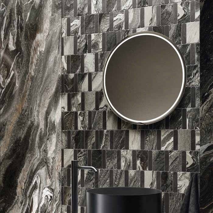 Aura не ограничивается интерьерными решениями. Керамика X2 может монтироваться на открытом воздухе, а плиты 120x278 в толщине 6 мм. применимы в качестве облицовки фасадов и при изготовлении предметов мебели, столешниц и радиаторов, кухонных островов. Вариативные мозаичные смеси помогут в выделение отдельных ниш, душевых зон.
