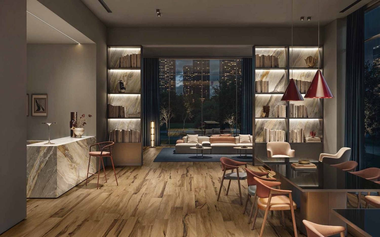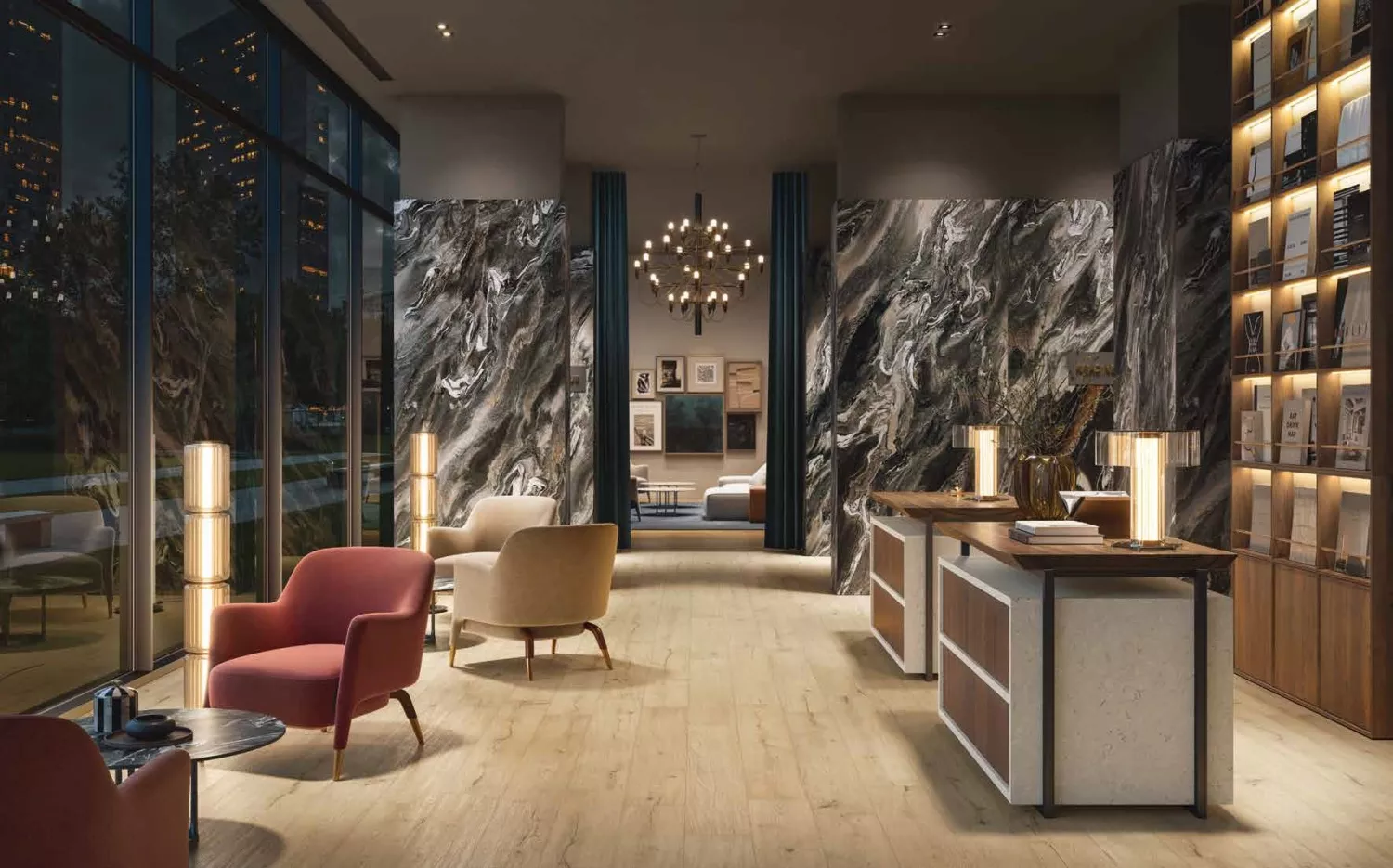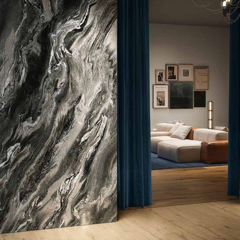 Слэбы XL габаритов 120x278 в двух цветах под мрамор с насыщенным рисунком.